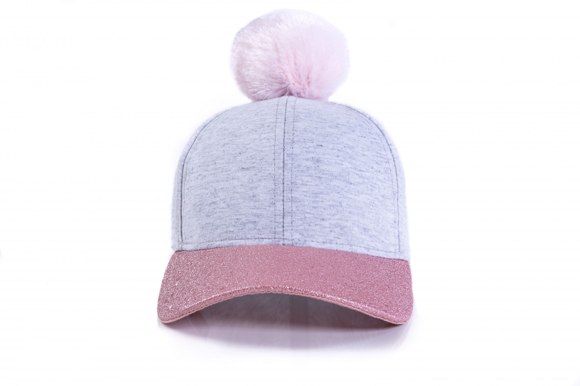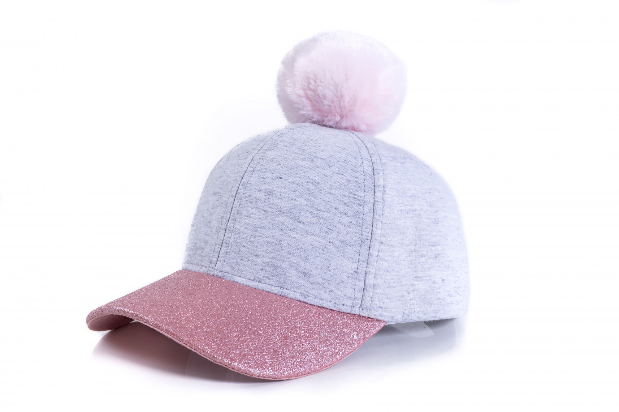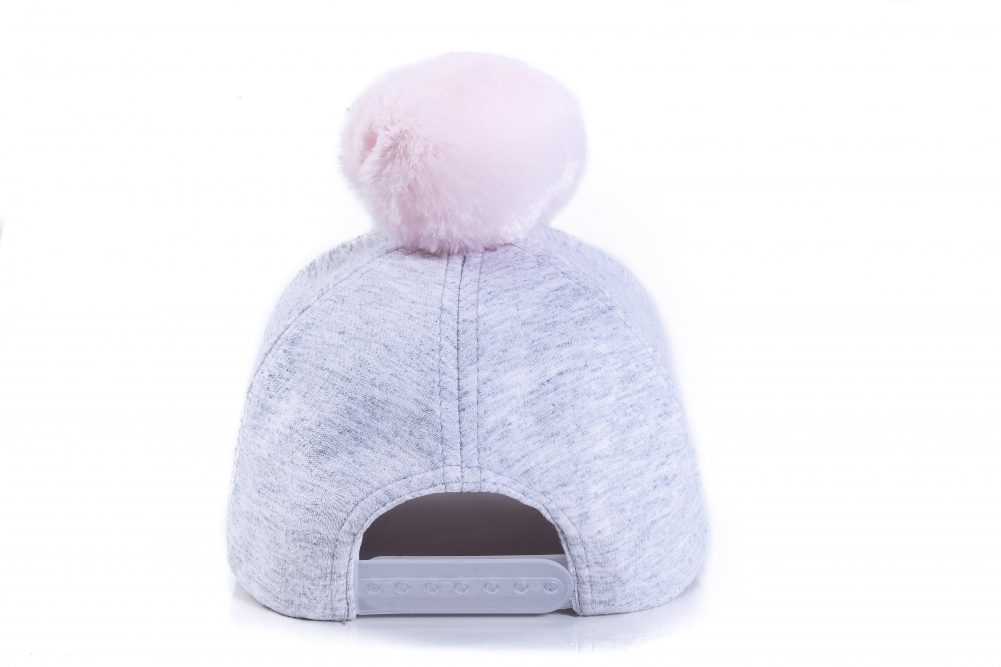 Boné feminino infantil, seis gomos, aba curva, entretelado, cores neutras, pompom rosa e regulador plástico com pino.